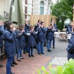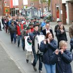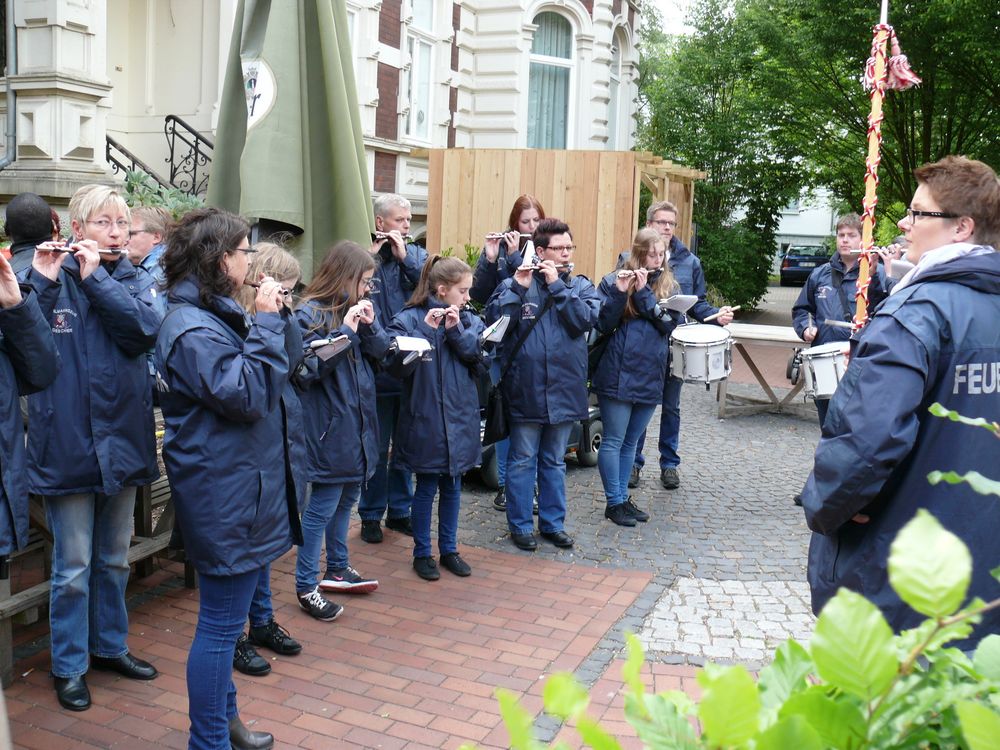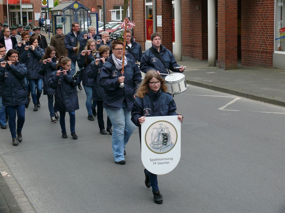 Zu einem etwas anderen Einsatz sind mehrere Kameraden der Feuerwehr und des Spielmannszuges Gescher am Pfingstsonntag ausgerückt. Die St. Pankratius Schützengilde Gescher stellte bereits zum zwölften Mal den Maibaum auf und hierbei unterstützten sie tatkräftig. Während die Musiker den Umzug vom Rathaus bis zur Hauptstraße anführten, packten die Kameraden mit technischem Gerät und mit Muskelkraft anschließend beim aufstellen des Maibaum mit an. Mit Hilfe von Stahlseil und Greifzug sicherte Einsatzleiter Stefan Theseling den Maibaum ab während einige Kameraden mit vereinten Kräften der anderen Vereine den Baum in die Höhe stemmten. Die Mitglieder des Spielmannszuges, unter der Leitung von Monique Dieks, sorgten in der Zwischenzeit für musikalische Unterhaltung.