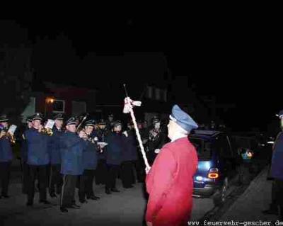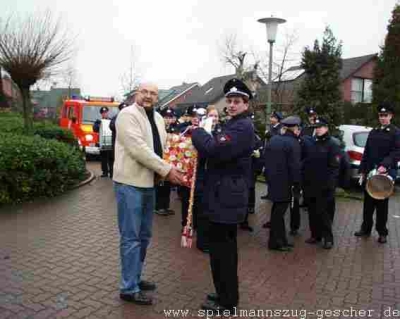 Gescher. Mit Musikzug und Spielmannszug im Gefolge ließ es sich die FF Gescher nicht nehmen, Oberbrandmeister Hermann Brands zu seinem 70. Geburtstag zu gratulieren. Zum Jubiläum nahm das Geburtstagskind den Tambourstab selbst in die Hand und ließ die Musiker nach seiner Mütz spielen. (Quelle: Feuerwehr)