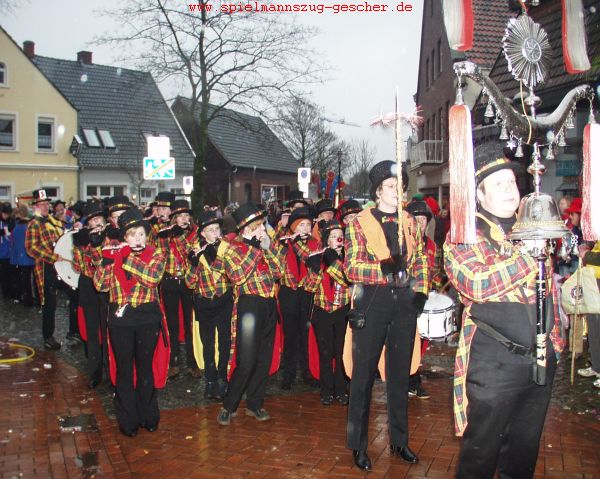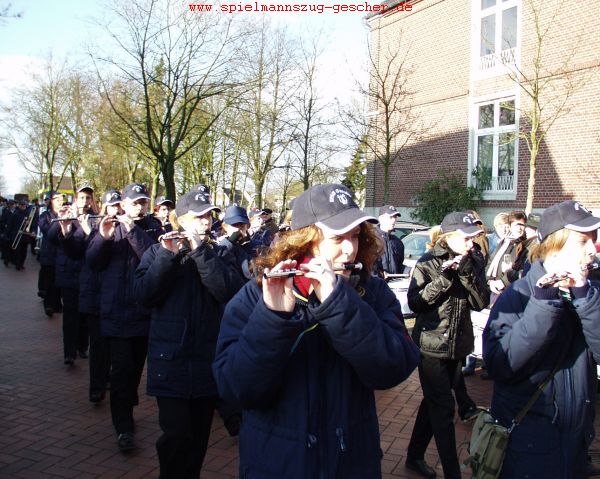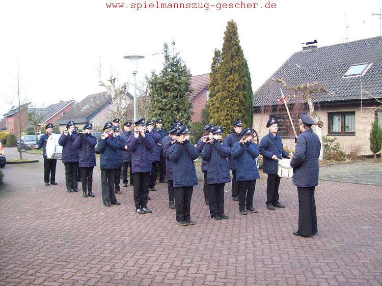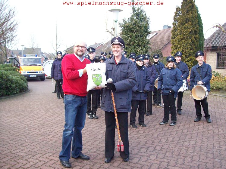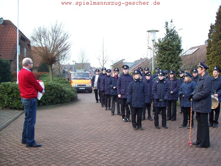 Mit Klang und Spiel verabschiedet der Spielmannszug der Freiw. Feuerwehr Gescher alljährlich am Silvestertag das alte Jahr. Grund aber auch der Bevölkerung der Glockengießerstadt ein frohes und gesundes Neues Jahr zu wünschen. Bürgermeister Heiner Theßeling nahm die musikalischen Wünsche der Spielleute stellvertretend für die Gescheraner entgegen. Bei klirrender Kälte, zog der Spielmannszug unter der Stabführung von Andrea Meyer und in Begleitung der Feuerwehr musizierend durch die Glockengießerstadt. Hiermit folgt der Spielmannszug einer alten Tradition. Dazu ist in der Chronik zu lesen: