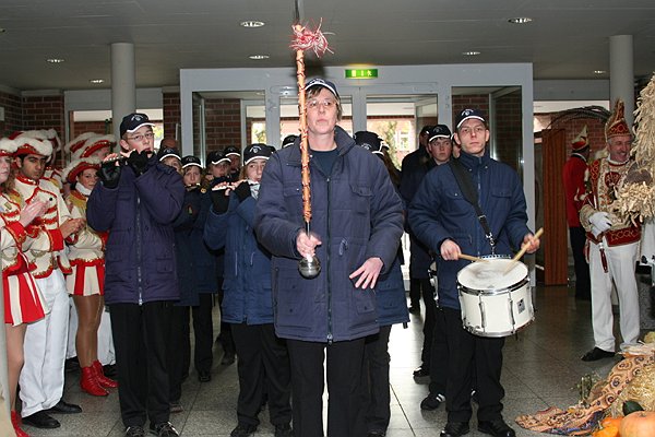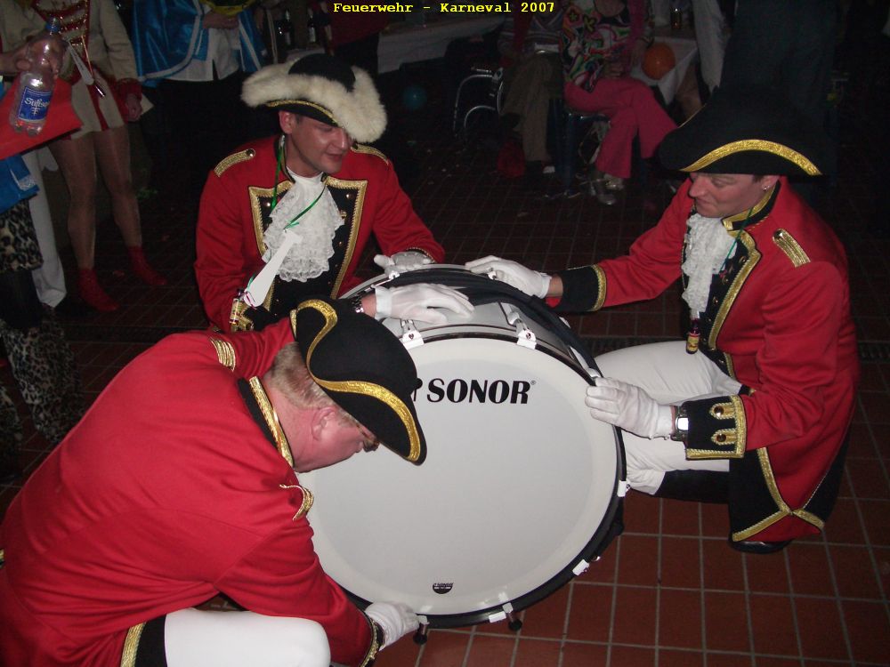 Erklärung: Beim Karnevalsauftakt am 11.11.06 stellte die Truppe Ihre Standarte in unmittelbarer nähe unsere abgestellten Instrumente ab. In einem Unbeobachteten Augeblick fiel sie auf unsere Pauke. Dieser Anlass wurde bei dem diesjährigen Tennengericht der Stadtkarnevalisten verhandelt. Die Strafe für die Verurteilte Truppe, auf unserem Karnevalsfest die Pauke zu Putzen.