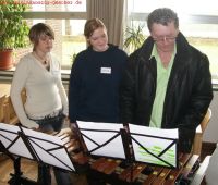 Katrin Winking (v.l) und Larissa Bühren schauen bei der Xylophon-Probe Andreas Schlagheck genau über die Schulter.